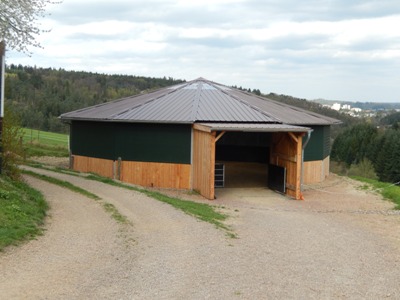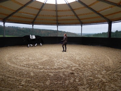 Die im Herbst 2013 neu erbaute lichtdurchflutete Longierhalle hat einen Innendurchmesser von 16m. Der Hallenboden ist ein Gemisch aus Sand und Vlies der Firma Heus. Die Longierhalle ist mit einem Windfangnetz ausgestattet, welches für optimale Belüftung sorgt und einen wunderbaren Blick nach draußen ermöglicht.