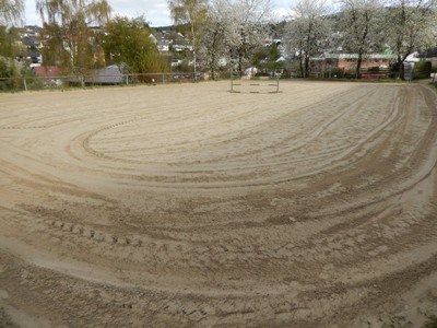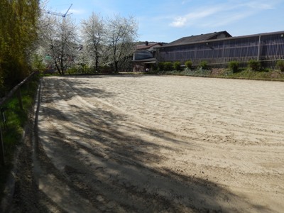 Unser von Obstbäumen und Sträuchern umgebener Reitplatz hat die Maße 20 x 40 m. Er ist ebenfalls mit einem Spezial-Quarzsand der Firma Heus ausgestattet. Die Tretschicht entwässert oberflächlich, sodass der Reitplatz auch nach schlechter Witterung lange bereitbar bleibt. Für die spring ambitionierten Reiter unter uns steht eine kleine Auswahl an Hindernissen zur Verfügung.